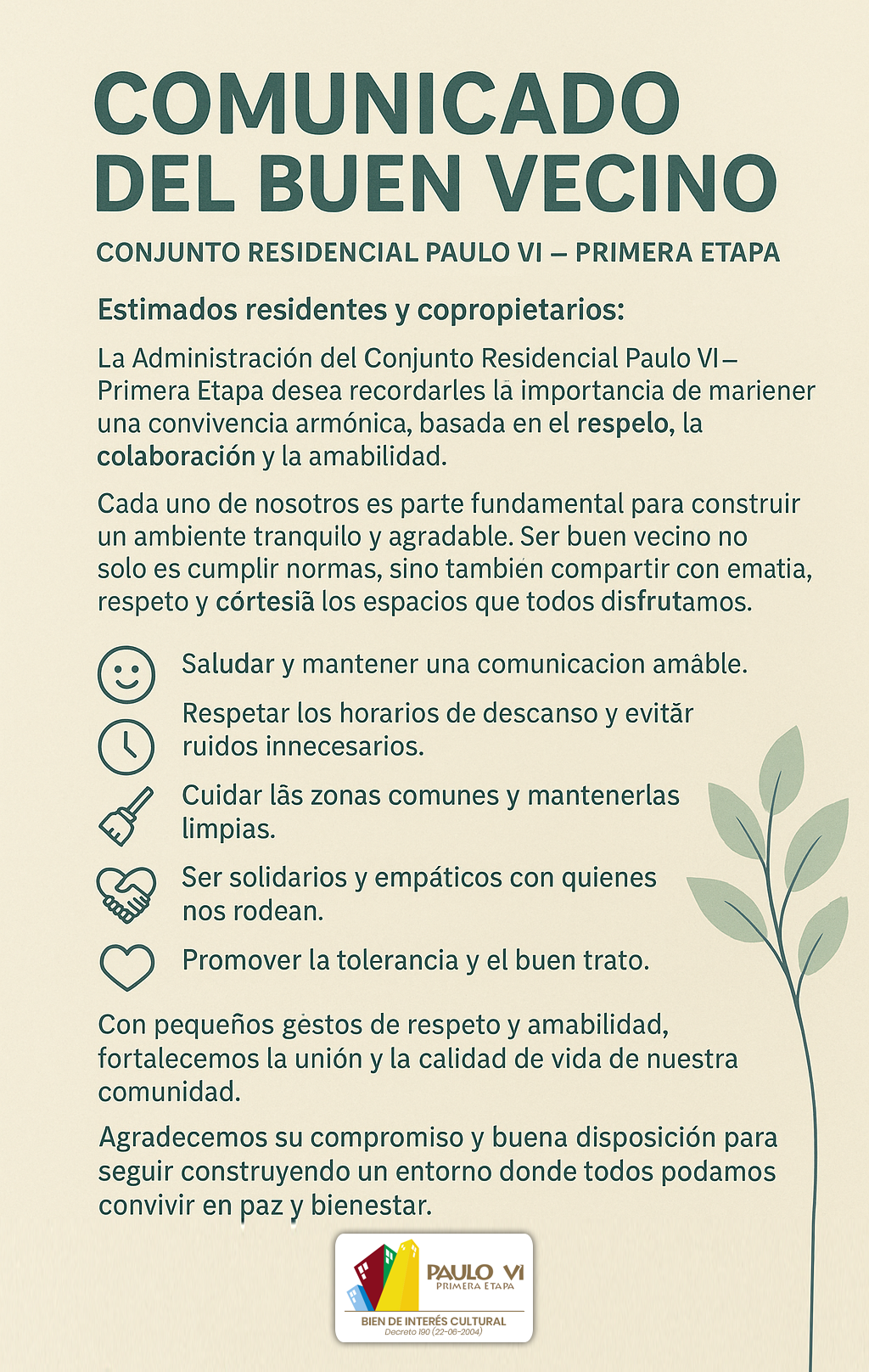 – No dejar basuras en pasillos, puertas o ascensores